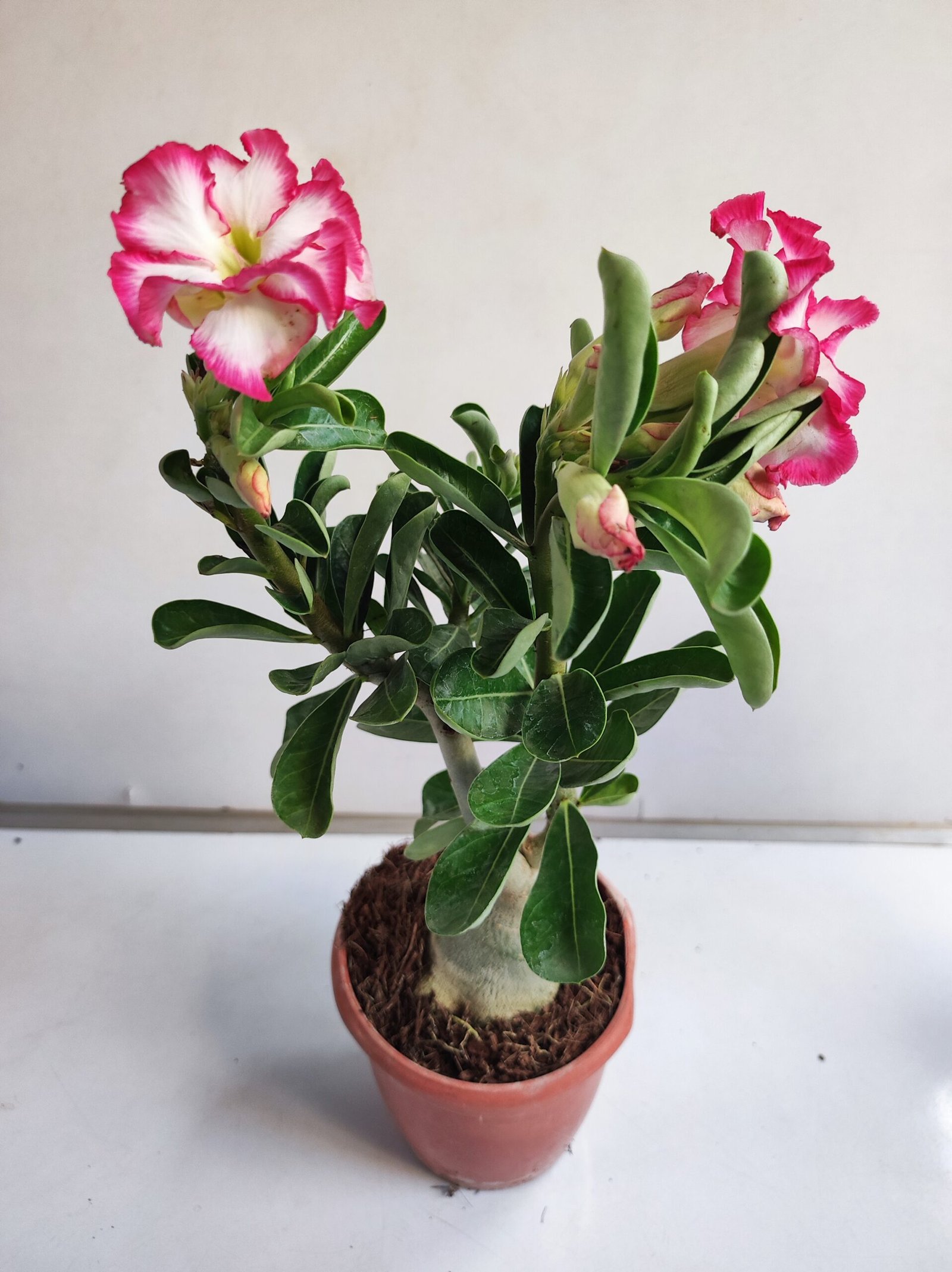 Appearance: Thick, swollen base (caudex) with glossy green leaves and showy, trumpet-shaped flowers in red, pink, or white.