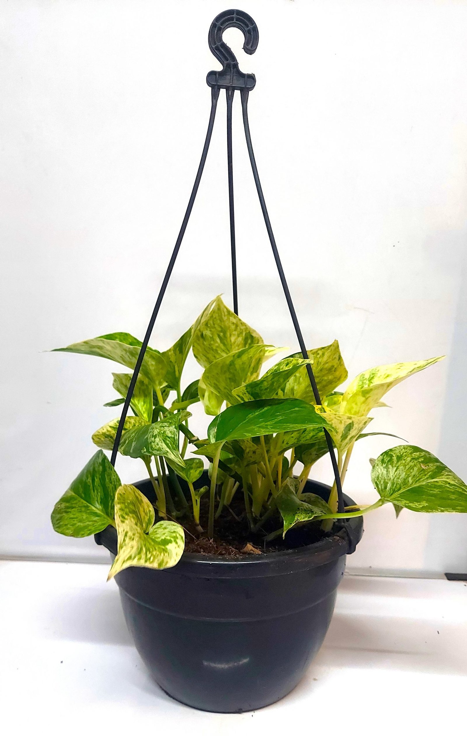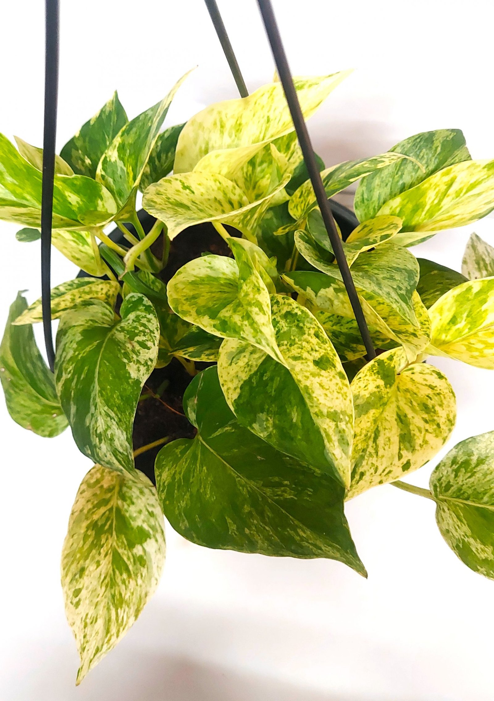 - Marble Queen (Epipremnum aureum ‘Marble Queen’) is a stunning variegated hanging plant known for its striking green leaves splashed with creamy-white patterns.